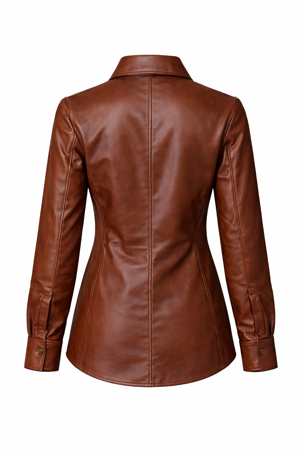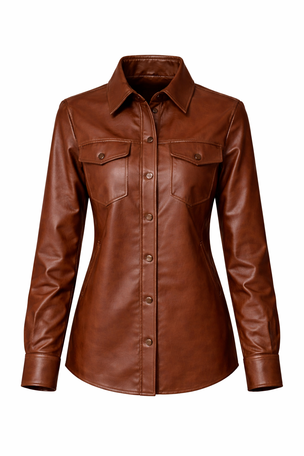 Step into the spotlight with our women's leather shirt in Brown. Crafted from fine sheepskin with a semi-aniline finish, this piece features a viscose lining for comfort. The turn-down collar and button cuffs elevate the classic design, while full sleeves and two buttoned breast pockets blend functionality with style. This shirt's button closure completes the chic, tailored look, ideal for both daytime sophistication and evening allure.